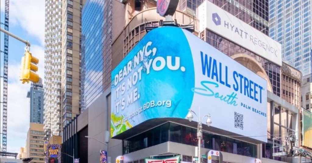 Palm Beach County is courting New York City businesses with a new Times Square billboard campaign bearing a tongue-in-cheek message: “Dear NYC, It’s Not You. It’s Me. Love, The Palm Beaches,” alongside the tagline “Wall Street South.”
